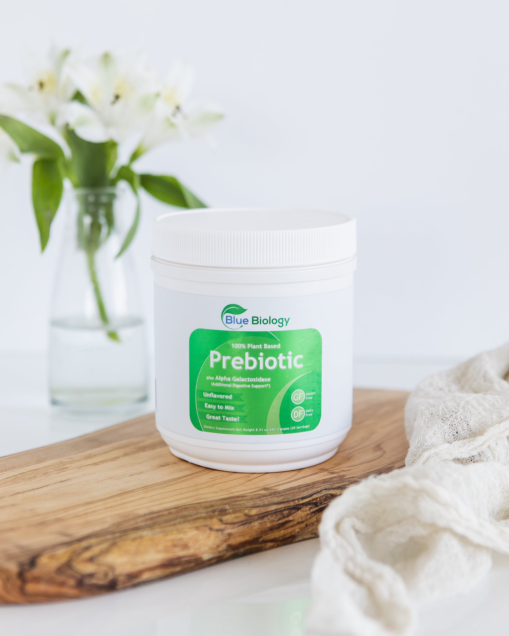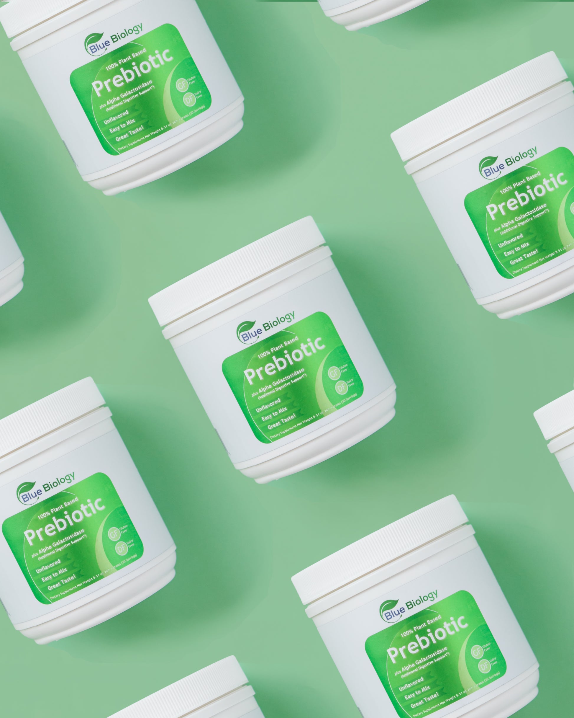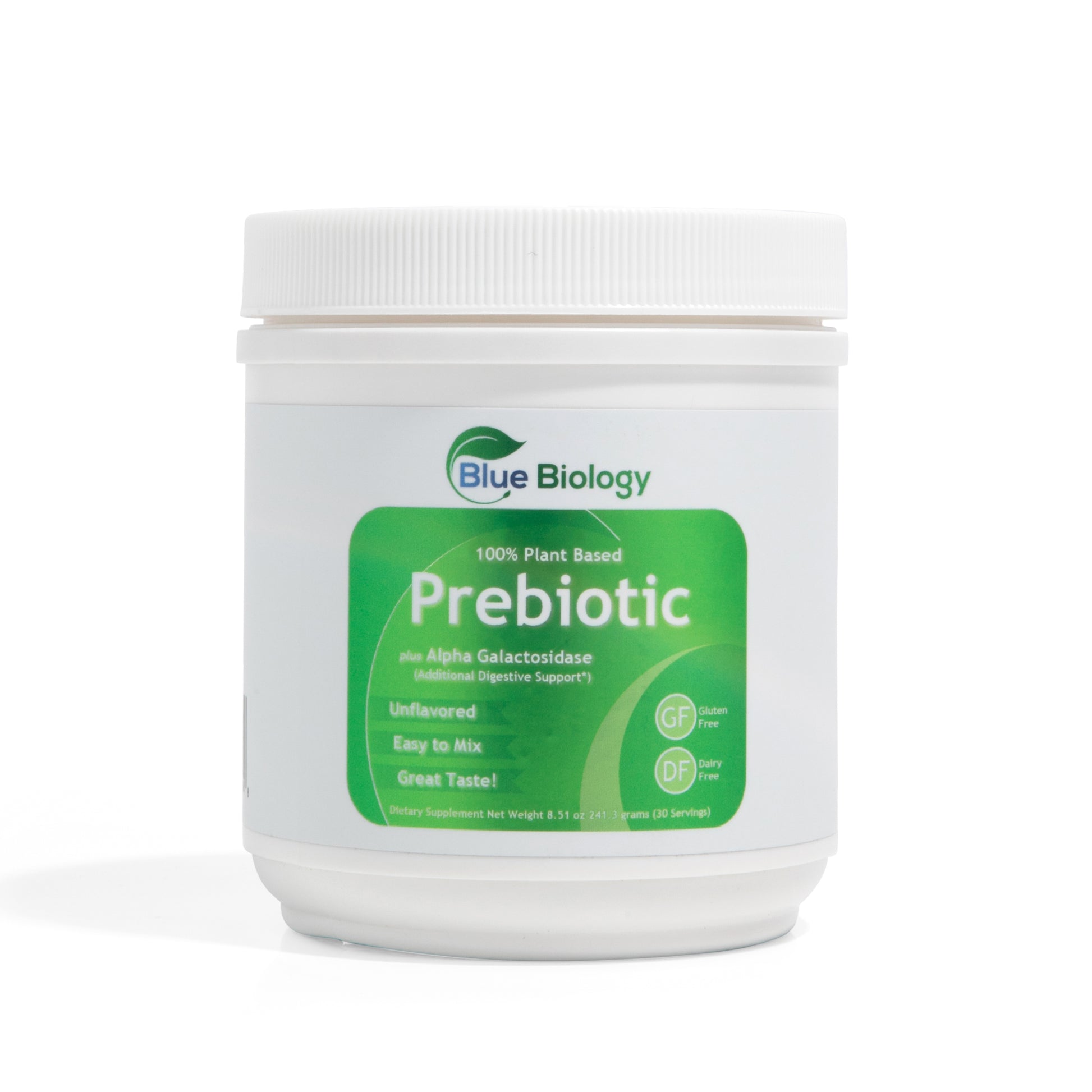 BlueBiology Prebiotic Powder contains a unique blend of fibers to support probiotic growth and improve overall gut health. Prebiotics are used to fuel the probiotics, or "good bacteria", that can be found in supplements like Bluebiotics: Ultimate Care or naturally within the gut.