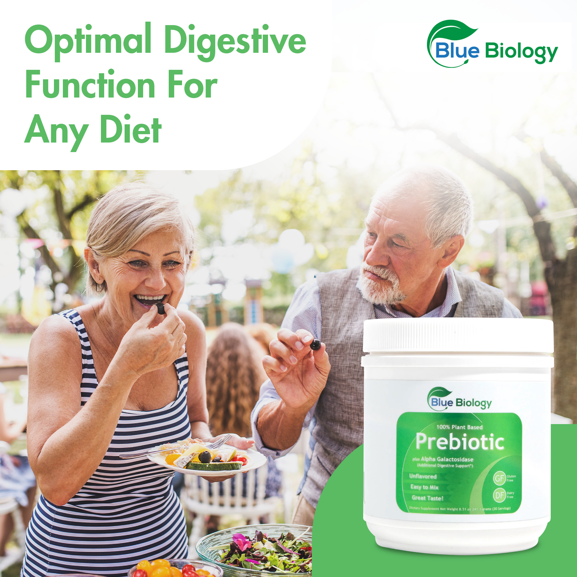 BlueBiology Prebiotic Powder's Alpha Galactosidase breaks down complex carbs, easing bloating for a happier gut, helping you look and feel your best.
